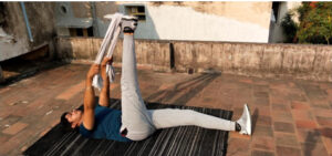 - Pull the towel towards your chest so that the left leg is raised in the air