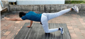 - Lift the hand opposite to the leg that is lifted, and bring it in front of you straight and parallel to your torso and lifted leg