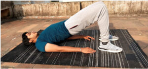 - Press your glutes (buttocks) down and lift your hips such that your shoulders, hips, and knees make a single, straight line at an angle to the floor